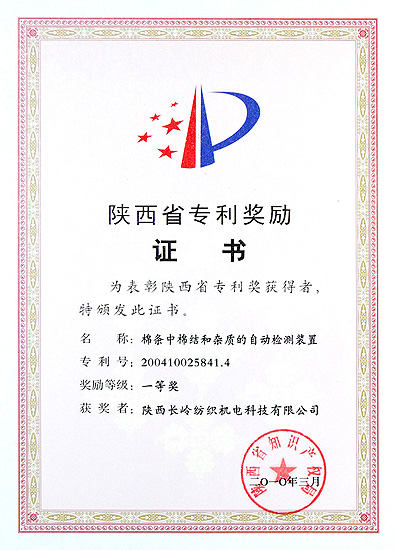在剛剛結(jié)束的陜西省2010年知識(shí)產(chǎn)權(quán)工作會(huì)議上,我公司的發(fā)明專利“棉條中棉結(jié)和雜質(zhì)的自動(dòng)檢測(cè)裝置”(專利號(hào)ZL200410025841.4)獲得2009年度陜西省專利獎(jiǎng)一等獎(jiǎng),副省長(zhǎng)朱靜芝為我公司頒發(fā)了獲獎(jiǎng)證書(shū)。全省共有六項(xiàng)專利技術(shù)獲一等獎(jiǎng)。此項(xiàng)榮譽(yù)的獲得,是對(duì)我公司多年堅(jiān)持自主創(chuàng)新構(gòu)建企業(yè)核心競(jìng)爭(zhēng)力的充分肯定,也將極大地推進(jìn)企業(yè)在促進(jìn)專利技術(shù)產(chǎn)業(yè)化方面不斷創(chuàng)新。