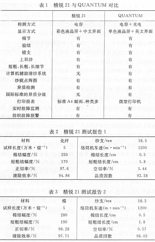 從表1對比中可以看出,USTER QUANTUM清紗器的主要特點是:把電容檢測和光電檢測結(jié)合在一個檢測頭中,同時把微處理器也裝在檢測頭中。其清紗功能全面,控制箱上能夠顯示清紗曲線和分級圖,直觀明了,能夠優(yōu)化清紗曲線。但其異質(zhì)檢測及清紗輔助系統(tǒng)為可選配部分,價格昂貴,一般廠家只購買其基本型。精銳21在技術(shù)水平上與QUANTUM基本相當(dāng),在功能方面如打印報表、中文菜單等方面優(yōu)于QUANTUM,售價僅為其1/2。性能價格比優(yōu)于QUANTUM電子清紗器,市場潛力較大。