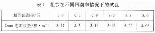 精紗回潮率在生產(chǎn)過(guò)程中牽伸纖維與纖維、纖維與機(jī)械表面之間相互磨擦容易引起纖維產(chǎn)生靜電,當(dāng)纖維間帶有相同電荷時(shí),由于同性電荷的相互排斥造成纖維之間互不抱合,從而引起紗條內(nèi)的纖維端因?yàn)殪o電而外露,增加紗線毛羽。從物理學(xué)的角度我們知道纖維的比電阻與纖維的回潮率成負(fù)相關(guān),而纖維的回潮率與其相對(duì)濕度成正相關(guān),即生產(chǎn)環(huán)境相對(duì)濕度大,纖維的回潮率大,其比電阻相對(duì)則偏小。因此,我們可通過(guò)提高生產(chǎn)環(huán)境的相對(duì)濕度來(lái)增加纖維的回潮率,從而降低纖維的比電阻,增加纖維在生產(chǎn)過(guò)程中產(chǎn)生的靜電荷的散逸速度,這樣可以從很大程度上消除纖維上的靜電,通過(guò)減小纖維間因靜電原因的相互排斥而頭尾外露,以達(dá)到降低毛羽的目的。表1是粗紗在不同回潮率情況下的試驗(yàn)對(duì)比。
