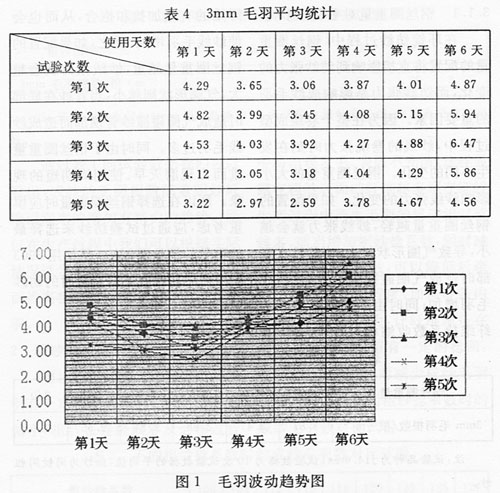 國(guó)內(nèi)鋼絲圈的使用期限一般5~7天,但具體使用期限還要根據(jù)各企業(yè)的實(shí)際情況而定。我公司在J14.6tex品種上選用的國(guó)產(chǎn)鍍氟鋼絲圈使用期限最多不超過(guò)5天。在剛上機(jī)后,成紗毛羽一般偏長(zhǎng),在經(jīng)過(guò)一個(gè)成熟期(大約是一排紗)后,成紗毛羽得到改善,在第2~3天毛羽較為穩(wěn)定,第4天毛羽有開始惡化的趨勢(shì),第5天毛羽明顯增加,此時(shí)就必須更換鋼絲圈。表4和圖1分別是鋼絲圈使用天數(shù)與3mm毛羽平均統(tǒng)計(jì)值相對(duì)應(yīng)的毛羽波動(dòng)趨勢(shì)圖。