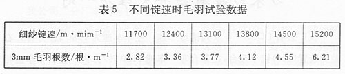 細(xì)紗錠速對(duì)紗線毛羽有較大的影響,從表4試驗(yàn)數(shù)據(jù)看出毛羽隨細(xì)紗錠速的增大而大幅度的上升。所以在實(shí)際生產(chǎn)過(guò)程中應(yīng)合理選擇細(xì)紗錠速,不要一味追求產(chǎn)量而忽視產(chǎn)品質(zhì)量,作為企業(yè)應(yīng)權(quán)衡產(chǎn)量和質(zhì)量的矛盾。表5是不同錠速時(shí)細(xì)紗毛羽測(cè)試數(shù)據(jù)。