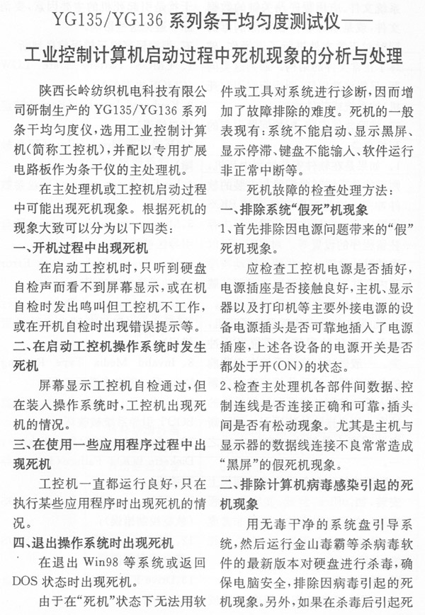 YG135/YG136系列條干均勻度測(cè)試儀——工業(yè)控制計(jì)算機(jī)啟動(dòng)過程中死機(jī)現(xiàn)象的分析與處理