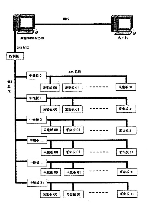 下位機為控制板、中繼板和采集板。采用兩級485總線采集數據和232接口與計算機通訊組成,如系統(tǒng)框圖所示??刂瓢逯饕瓿蓴祿蠄蠛蛿祿樵儯欣^板主要對接收到的控制板數據進行解釋、說明和選擇傳送以及將采集板上傳的數據轉發(fā)給控制板,采集板根據接收的數據和自己的狀態(tài)發(fā)送不同的數據。