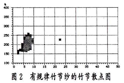 通過上述各項性能指標,可以方便的觀察被測試的竹節(jié)紗的質(zhì)量狀況,下面通過對兩種竹節(jié)紗的測試,說明這些指標的實際應(yīng)用,由于竹節(jié)紗的測試指標較多,所以在列舉圖形指標時只列舉具有代表意義的散點圖和竹節(jié)間距柱狀圖。