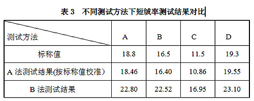 B法檢測(cè)過(guò)程中,因檢測(cè)人員的目光、手法,取樣量大小等人為因素而影響測(cè)試結(jié)果;而A法由于取樣量大代表性強(qiáng),所以具有一定的準(zhǔn)確性。表3是4種具有短絨標(biāo)稱值的棉花,用兩種方法的測(cè)試結(jié)果,可以看出,快速短絨測(cè)試儀的16mm重量短絨測(cè)試結(jié)果正確性較好。