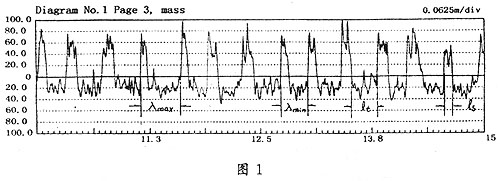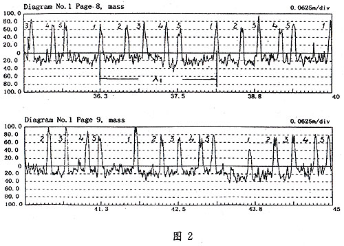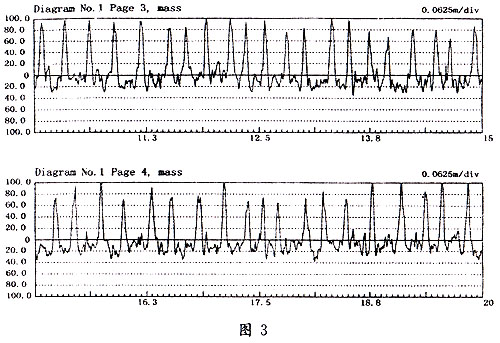 根據(jù)不勻曲線圖可以統(tǒng)計(jì)竹節(jié)的數(shù)目,從而確定平均每米有多少個(gè)竹節(jié)。圖1所示在約5m長(zhǎng)度內(nèi)有14個(gè)竹節(jié)即平均每米約2.6個(gè)竹節(jié)。