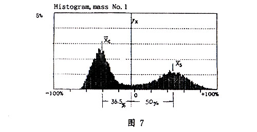 根據(jù)線密度頻率分布圖上的 、 t、 s在橫軸上的位置確定 t、 s相對(duì)于 偏移的百分?jǐn)?shù),從而得出線密度增加倍數(shù)即倍粗= s / t。取竹節(jié)紗以圖7為例,平均線密度的相對(duì)值 =100(%),則基紗平均線密度的相對(duì)值 t=100 - 36.5= 63.5(%),竹節(jié)部分平均線密度的相對(duì)值 s=100+50=150(%),由此可得倍數(shù)= s/ t=150/63.5≈2.36倍,該值反映了竹節(jié)的相對(duì)粗度,其可影響布面的凹凸立體感風(fēng)格。
