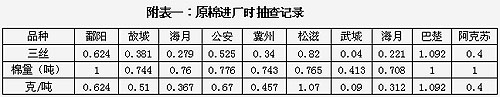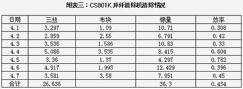 現(xiàn)對(duì)福建一用戶具體使用情況進(jìn)行了跟蹤統(tǒng)計(jì),內(nèi)容包括對(duì)用戶采購的原棉抽檢具體數(shù)據(jù)見附表一;每天配棉及人工挑揀情況具體數(shù)據(jù)見附表二;CS801K異纖清除機(jī)清除情況見附表三。通過表一的具體數(shù)據(jù)可以計(jì)算出來用戶入庫原棉平均每噸折合三絲為0.52克,如果假設(shè)人工檢出效率為50%,則每噸棉花實(shí)際含異纖量應(yīng)為1.04克。經(jīng)過用戶對(duì)于異纖含量較高的棉花進(jìn)行人工挑揀,附表二的具體數(shù)據(jù)可以計(jì)算出平均每噸棉花人工棉出三絲0.36克,棉花實(shí)際殘存異纖含量應(yīng)為0.68克,從表三數(shù)據(jù)可以計(jì)算出異纖清除機(jī)的清除效率為72.5%,即0.493/0.68×100%=72.5%。(在此統(tǒng)計(jì)的數(shù)據(jù)里面不包含各種顏色的布?jí)K線頭和各種雜質(zhì),只統(tǒng)計(jì)了丙綸絲、頭發(fā)絲、棕絲、塑料片和羽毛)。