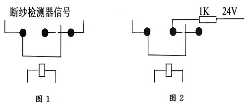 精銳30B的工作原理及其使用與精銳30相同。清紗原理都是采用電容式、絕對測量原理、嵌入式處理技術(shù)設(shè)計(jì)而成的。廣泛用于轉(zhuǎn)杯紡紗機(jī)上,主要功能是清除紗線上有害紗疵。采用16錠1組的處理模式,具有材料系數(shù)自動(dòng)調(diào)整功能,可以按左、右車設(shè)定材料系數(shù)、紗號;可完成棉結(jié)、短粗節(jié)、長粗節(jié)、細(xì)節(jié)四種紗疵的清除(30B具有清除竹節(jié)紗疵功能);可進(jìn)行全程錯(cuò)支檢測、數(shù)據(jù)統(tǒng)計(jì)、定長、在線自檢和故障報(bào)警;也可進(jìn)行聯(lián)網(wǎng)。整個(gè)裝置由二級87C196KD微處理器構(gòu)成,具有16位數(shù)據(jù)總線和10位A/D,運(yùn)行速度快、A/D轉(zhuǎn)換精度高。上位機(jī)由電控箱內(nèi)的控制器組成,下位機(jī)由10至20個(gè)處理器中的單片機(jī)組成,構(gòu)成一個(gè)主從式二級微處理器系統(tǒng)。上位機(jī)主要完成機(jī)組、紗線品種、清紗門限、定長、班次等數(shù)據(jù)的設(shè)定,數(shù)據(jù)統(tǒng)計(jì),自檢和故障報(bào)警等功能。下位機(jī)主要完成多路數(shù)據(jù)采集,程控增益放大,各種紗疵判斷,發(fā)出紗疵清除信號,同時(shí)與控制器通訊,完成各種數(shù)據(jù)傳送。精銳30的斷紗原理是由于受到安裝位置的限制,精銳30的檢測頭不帶切刀,如果發(fā)現(xiàn)需要清除的紗疵就需要和主機(jī)結(jié)合進(jìn)行斷紗。精銳30通過繼電器和主機(jī)結(jié)合,清紗器控制繼電器動(dòng)作,繼電器的兩個(gè)觸點(diǎn)和主機(jī)的斷紗檢測器的信號線相連接。目前清紗器要求主機(jī)斷紗有兩種情況:一種是繼電器的常閉端、公共端和斷紗檢測器的信號線相連(也就是說把斷紗檢測器的信號線截?cái)?,將繼電器的常閉端、公共端串入),如圖1,如發(fā)現(xiàn)需要斷紗,控制繼電器動(dòng)作,常閉端斷開,斷紗檢測器信號中斷,主機(jī)停止喂棉形成斷紗,泰坦、蘇拉、精工機(jī)器屬于此類(電纜7#、8#是此接法);另一種是通過繼電器的常開端、公共端將主機(jī)的24V電源經(jīng)過1K電阻并到斷紗檢測器上,不需要斷紗時(shí),繼電器在常閉端上(常閉端為懸空),需要斷紗時(shí),繼電器動(dòng)作,24V電源通過繼電器加到主機(jī)控制板上,主機(jī)停止喂棉形成斷紗,日發(fā)公司的RFRS10/30屬于此類(電纜5#、6#、8#、9#是此接法),如圖2。