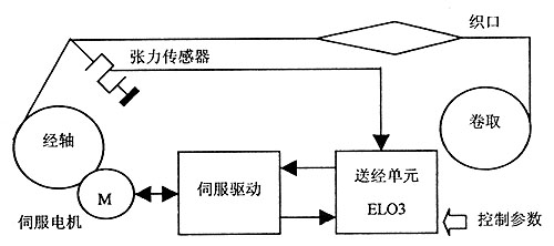 送經(jīng)控制系統(tǒng)通過檢測經(jīng)紗張力和織機主軸轉(zhuǎn)速,在保持經(jīng)紗張力恒定的情況下,不斷地將經(jīng)紗送入織口,這部分主要包括送經(jīng)單元ELO3、伺服驅(qū)動器Servodriver、伺服電機Servomotor,這是一個典型地伺服控制系統(tǒng),伺服驅(qū)動器和伺服電機構(gòu)成速度環(huán)和電流環(huán),加上送經(jīng)單元進一步構(gòu)成位置環(huán)和張力環(huán)。工作示意如圖5。送經(jīng)單元ELO3通過檢測織機主軸轉(zhuǎn)速,根據(jù)緯密計算出送出基本速度,再檢測經(jīng)紗實際張力,與目標(biāo)張力比較后得出速度偏差,對基本速度進行修正,將速度指令送到伺服驅(qū)動器,伺服驅(qū)動器根據(jù)速度指令控制伺服電機精確運轉(zhuǎn),伺服電機通過減速機構(gòu)傳動經(jīng)軸送出經(jīng)紗。