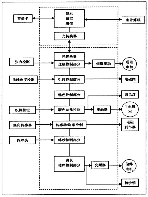 PZK3系列噴氣織機控制系統(tǒng)根據(jù)其控制動作和功能大致可分為五部分:數(shù)據(jù)設(shè)定和生產(chǎn)統(tǒng)計系統(tǒng);織機順序動作控制系統(tǒng);送經(jīng)控制系統(tǒng);引緯控制系統(tǒng)。系統(tǒng)框圖如下:圖中虛線以內(nèi)為控制系統(tǒng),虛線以外左側(cè)為輸入檢測對象,右側(cè)為輸出控制對象。