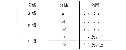b) 馬克隆值分為A、B、C三個(gè)級(jí), B 級(jí)分為B1、B2 兩檔,C 級(jí)分為C1、C2 兩檔;馬克隆值分級(jí)分檔范圍見表3。