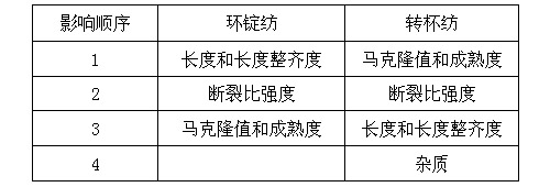 一般說來細(xì)度、長度、強(qiáng)力較好的原棉,能夠紡織出較細(xì)、強(qiáng)力和條干較好的紗,同時(shí)能夠減少斷頭,提高紡紗的效率。試驗(yàn)證明,在環(huán)錠紡中長度和長度整齊度對(duì)成紗強(qiáng)力的影響約占42%,斷裂比強(qiáng)度約占20%,馬克隆值約占15%。轉(zhuǎn)杯紡中長度和長度整齊度約占29%,斷裂比強(qiáng)度約占24%,馬克隆值約占14%。由此可見轉(zhuǎn)杯紡對(duì)長度方面的要求比環(huán)錠紡要低。原棉對(duì)環(huán)錠紡和轉(zhuǎn)杯紡的紡紗工藝的影響順序見表6。