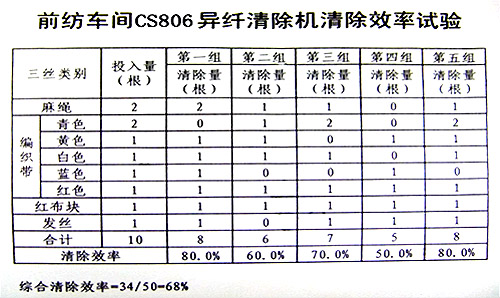分析清除效率,設(shè)備正常生產(chǎn)中,在異纖機前級開棉機出口投入標準考核異纖樣本,從廢棉中撿出的樣本與樣本總投入數(shù)量的比值。