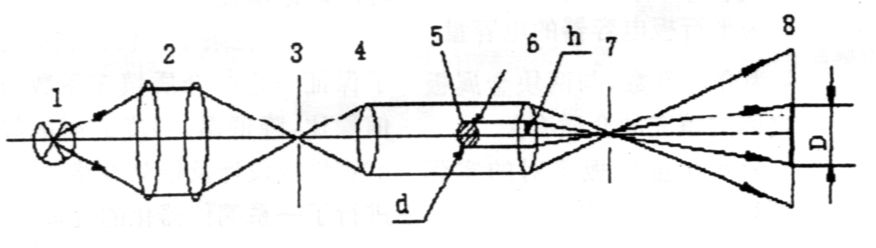 光電式條干測(cè)量是在紗線快速通過檢測(cè)區(qū)且紗線本身有抖動(dòng)的狀態(tài)下進(jìn)行的非接觸瞬時(shí)測(cè)量,所以測(cè)量的光學(xué)系統(tǒng)應(yīng)是一個(gè)遠(yuǎn)心光路系統(tǒng)。其原理如圖2所示,光源1經(jīng)過聚光透鏡2聚焦于光欄3,由準(zhǔn)直物鏡4形成準(zhǔn)直光束,對(duì)紗線5作背景照明,再經(jīng)投影物鏡6在光電接收器靶面上形成放大的陰影像D,對(duì)這個(gè)陰影像進(jìn)行測(cè)量,可達(dá)到紗線直徑測(cè)量之目的,此方法也稱投影放大法。在光學(xué)上,紗線直徑測(cè)量可用下式表達(dá):