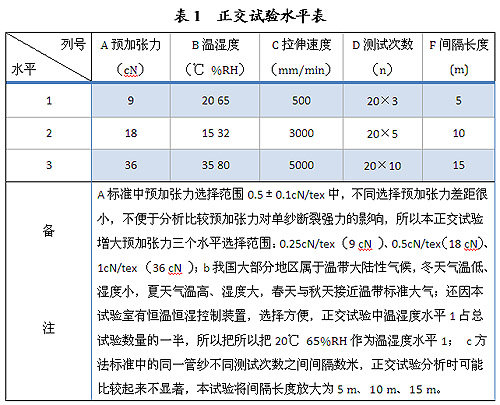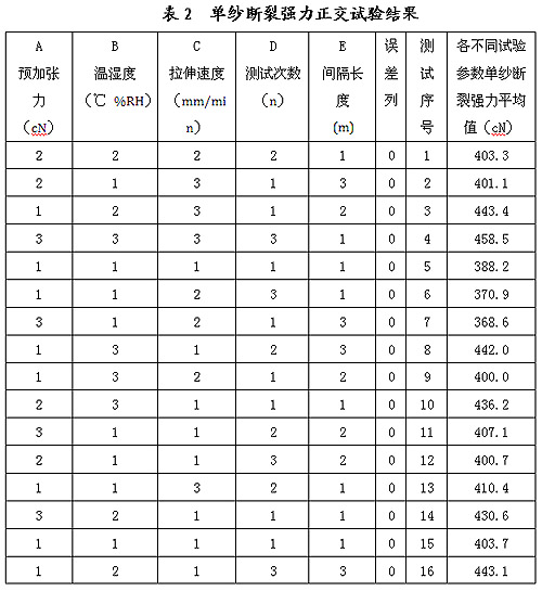以上測試參數(shù)均對單紗斷裂強力測試偏離產(chǎn)生影響,這些因素對單紗斷裂強力的影響各不相同。為科學(xué)、準確、嚴謹?shù)乜刂聘鳒y試參數(shù),減少測量不確定度,我們應(yīng)用正交試驗,對單紗斷裂強力各測試參數(shù)進行分析比較,依據(jù)不同參數(shù)對測試結(jié)果的不同影響設(shè)置測試參數(shù),以此提高單紗斷裂強力準確性和可靠性。
