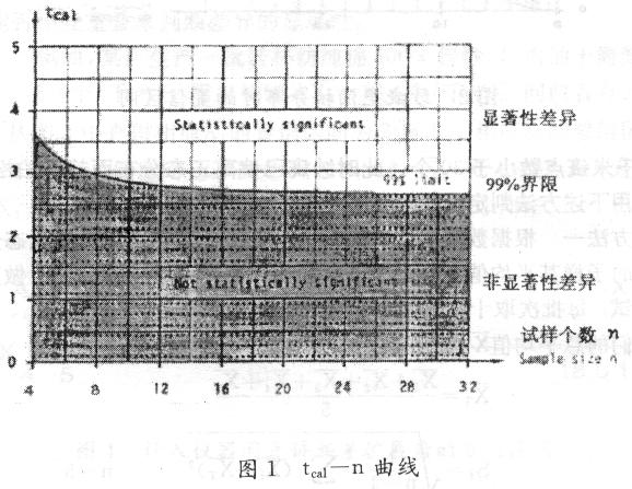 查圖1所給的tcal—n曲線,相應(yīng)式樣個(gè)數(shù)n=10時(shí)分界線上的t值為2.8 (可信度99%),現(xiàn)計(jì)算所得的tcal<2.8即位于陰影區(qū)內(nèi),說(shuō)明上述對(duì)千米棉結(jié)數(shù)的兩測(cè)試結(jié)果不存在顯著性差異。