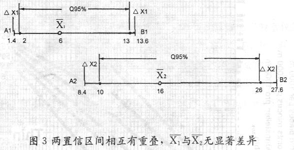 圖3 兩置信區(qū)間相互有重疊,X1 與X2無(wú)顯著差異
