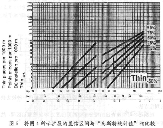將圖4所示擴(kuò)展后的置信區(qū)間繪入2001年版“烏斯特統(tǒng)計(jì)值”中相應(yīng)于10tex的垂直位置上(見(jiàn)圖5),上、下兩端分別對(duì)應(yīng)千米細(xì)節(jié)數(shù)4及19.5。其表示該批紗線的細(xì)節(jié)(-50%)約位于“烏斯特統(tǒng)計(jì)值”的18%和70%之間,說(shuō)明這批紗線的細(xì)節(jié)比占世界產(chǎn)量18%的紗的質(zhì)量為差,而比占世界產(chǎn)量30%的紗要好,從圖5中可看出屬中等偏上水平。