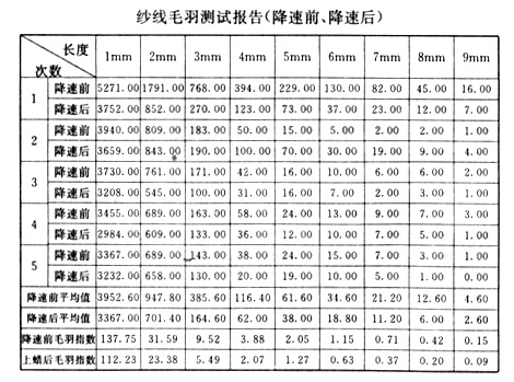 通過以上數(shù)據(jù)對比不難看出上蠟后毛羽數(shù)量少于上蠟前,降速后毛羽數(shù)量少于降速前,這樣我們就可以在實際生產(chǎn)中根據(jù)客戶對毛羽指標的不同要求來適當調整工藝。