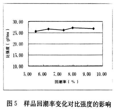 在不同的環(huán)境條件下分別對(duì)棉樣進(jìn)行予調(diào)濕,然后測(cè)其比強(qiáng)度,比強(qiáng)度與回潮率的關(guān)系見圖5。